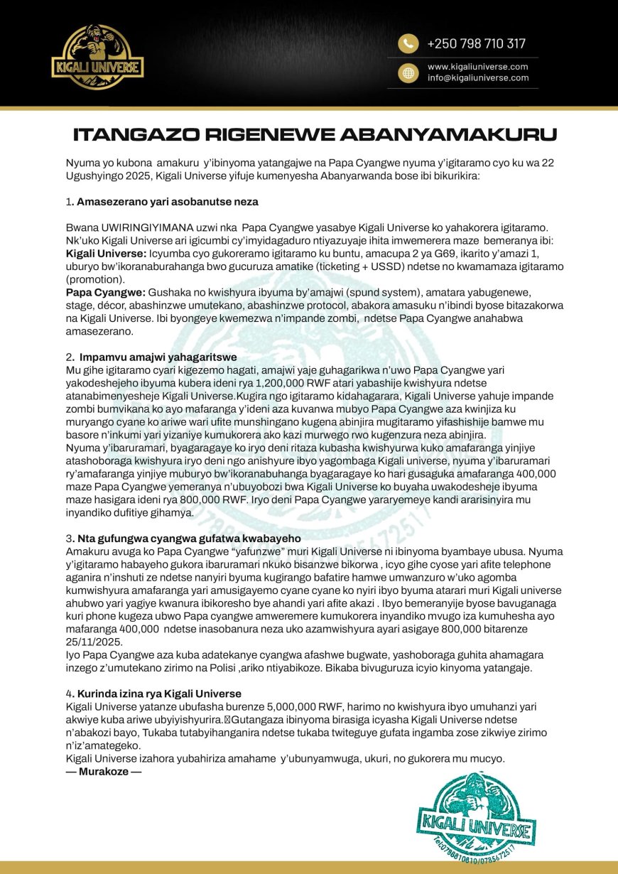 Ubuyobozi bwa Kigali Universe yabereyemo igitaramo cya Papa Cyangwe yizihirijemo imyaka itanu bashyize hanze itangazo rigenewe abanyamakuru rikuraho urujijo. Ni itangazo ryagiye hanze ku mugoroba wo ku wa 26 Ugushyingo 2025.