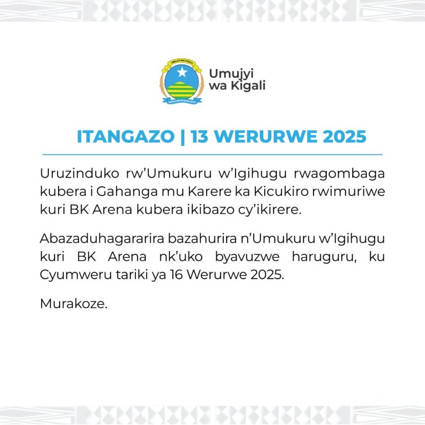 Mu itangazo Umujyi wa Kigali washyize ahagaragara, wavuze ko iki gikorwa cyo kuganira n'abaturage kizaba kuri iki Cyumweru taliki ya 16 Werurwe 2025, kikabera mu nyubako ya BK Arena aho gukomereza mu Karere ka Kicukiro nk'uko byari biteganyijwe.
