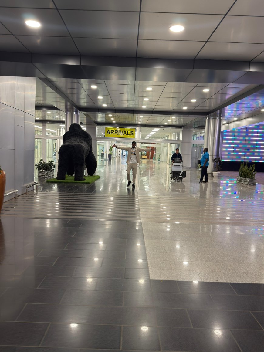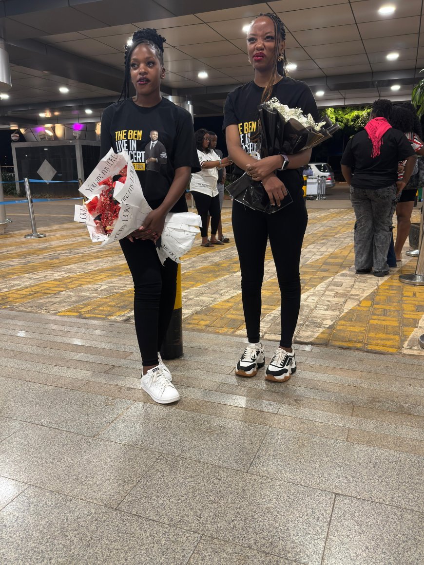 Akigera ku kibuga mpuzamahanga cy'indege cya Entebbe yahasanze abakobwa bafite indabyo, abambaye imyenda iriho ifoto ye, imodoka zamuherekeje zanditseho The Ben ndetse hari imodoka ya polisi yamuherekeje kugera kuri Kampala Serena Hotel.