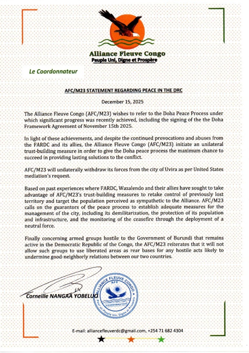 Mu itangazo ryasohotse ku wa 15 Ukuboza 2025, rishyizweho umukono n’Umuhuzabikorwa wa AFC/M23, Corneille Nangaa Yobeluo, iri huriro ryavuze ko iki cyemezo kigamije kubaha ubusabe bwa Leta Zunze Ubumwe za Amerika no kubaka icyizere no gushyigikira ibiganiro by’amahoro bikomeje, by’umwihariko ibiganiro bya Doha.