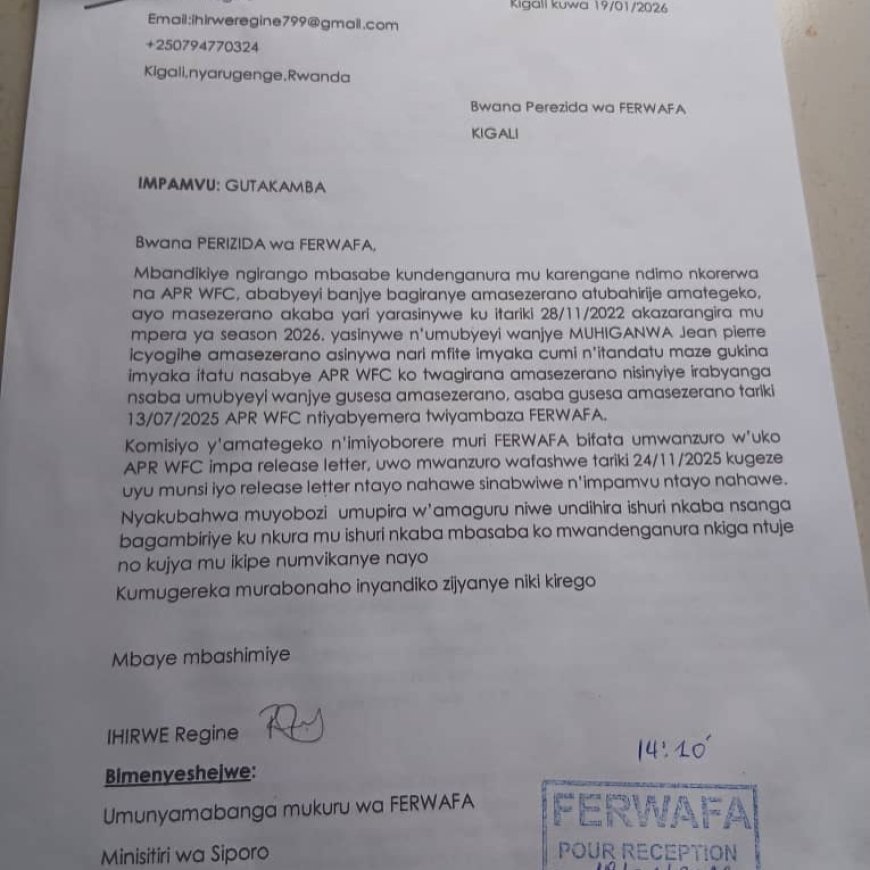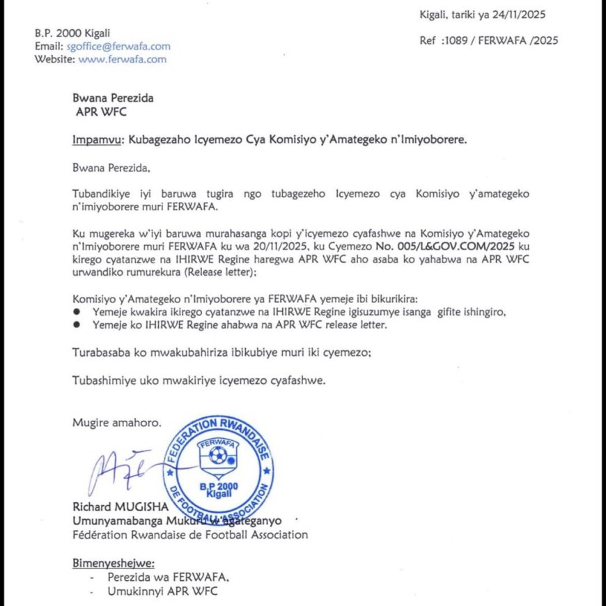 Ku wa 24 Ugushyingo 2025, Komisiyo y’Amategeko n’Imiyoborere ya FERWAFA yari yategetse APR WFC kumuha “Release Letter”, ariko irajurira. Komisiyo y’Ubujurire yakiriye Ubujurire ariko isanga nta shingiro bufite, igumishaho umwanzuro wafashwe mbere.