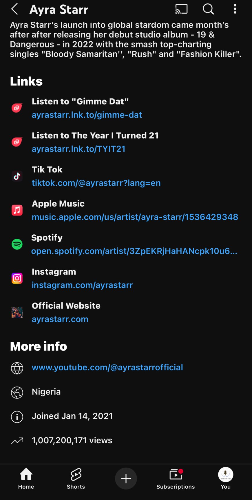 Ayra Starr ni we uri ku isonga mu kugira abantu benshi barebye indirimbo ze kuri YouTube, aho indirimbo ye yamamaye yitwa ‘Rush’, yanahataniye ibihembo bya Grammy, imaze kurebwa n’abantu barenga miliyoni 450.
