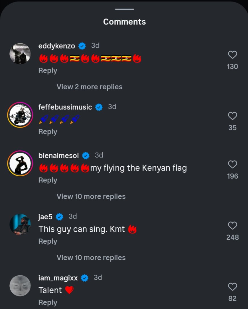 Urugero rwa hafi kuri Bien Aime ni nkaho yagiye ku mashusho ya Joshua Baraka ari kuri konti ye ya Instagram, aririmba muri 'Afro Nation', akandika ati "Ibendera rya Kenya riri kuzamurwa".