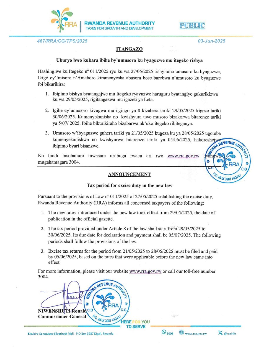 Pursuant to the provisions of Law n°011/2025 of 27/05/2025 establishing the excise duty,Rwanda Revenue Authority (RRA)informs all concened taxpayers of the following: