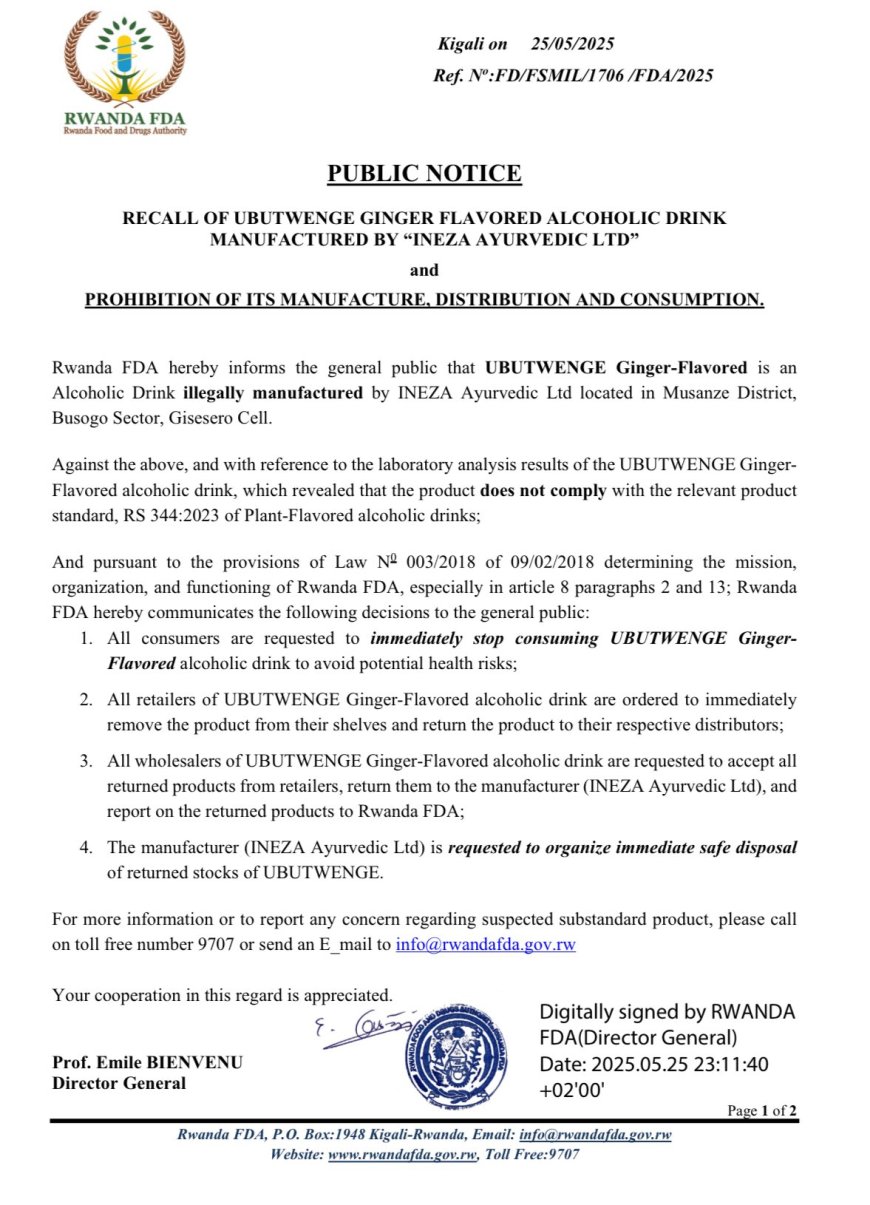 In a statement issued on Monday, May 26, Rwanda FDA informed the public that the alcoholic drink “illegally manufactured by INEZA Ayurvedic Ltd in Musanze District, has been recalled and prohibited due to non-compliance with quality standards.”