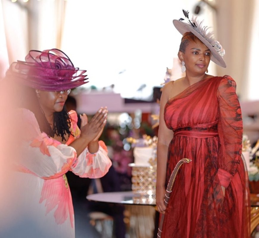 Nominated Senator Karen Nyamu shares a cheerful moment with a guest during Allan Chesang and Chanelle Kittony’s pre-wedding ceremony. Her radiant smile and stylish maroon outfit added charm and warmth to the star-studded celebration.