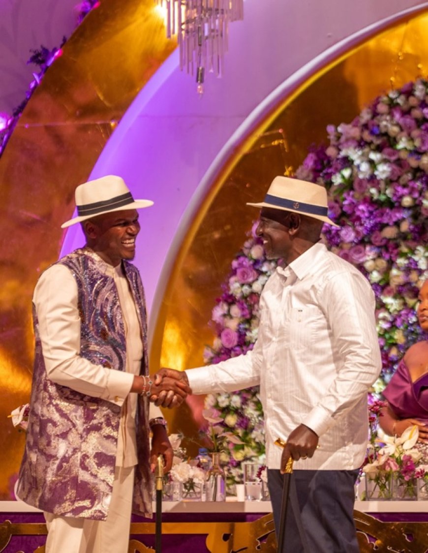 President William Ruto shares a light moment with Trans Nzoia Senator Allan Chesang during the senator’s pre-wedding ceremony with Chanelle Kittony. The lilac-and-gold-themed event radiated elegance and unity as leaders joined in the celebration.