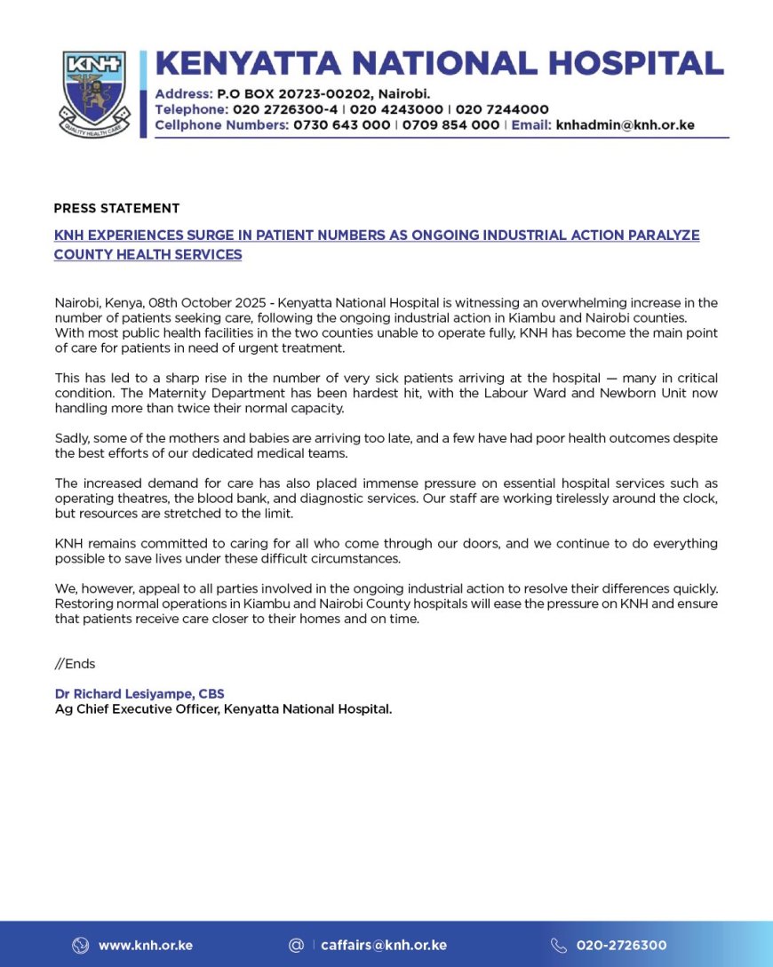 Kenyatta National Hospital (KNH) is struggling to handle a sharp increase in patients after health workers in Nairobi and Kiambu counties went on strike, crippling public hospitals. Acting CEO Dr. Richard Lesiyampe said the hospital’s maternity, theatre, and diagnostic units are overstretched as hundreds seek urgent care. He urged for a quick resolution to ease the pressure on KNH.