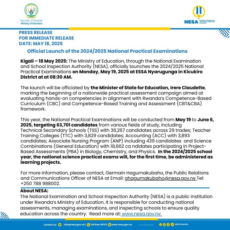 The Ministry of Education, through the National Examination and School Inspection Authority (NESA), officially launches the 2024/2025 National Practical Examinations today, May 19, 2025 at ESSA Nyarugunga in Kicukiro District.