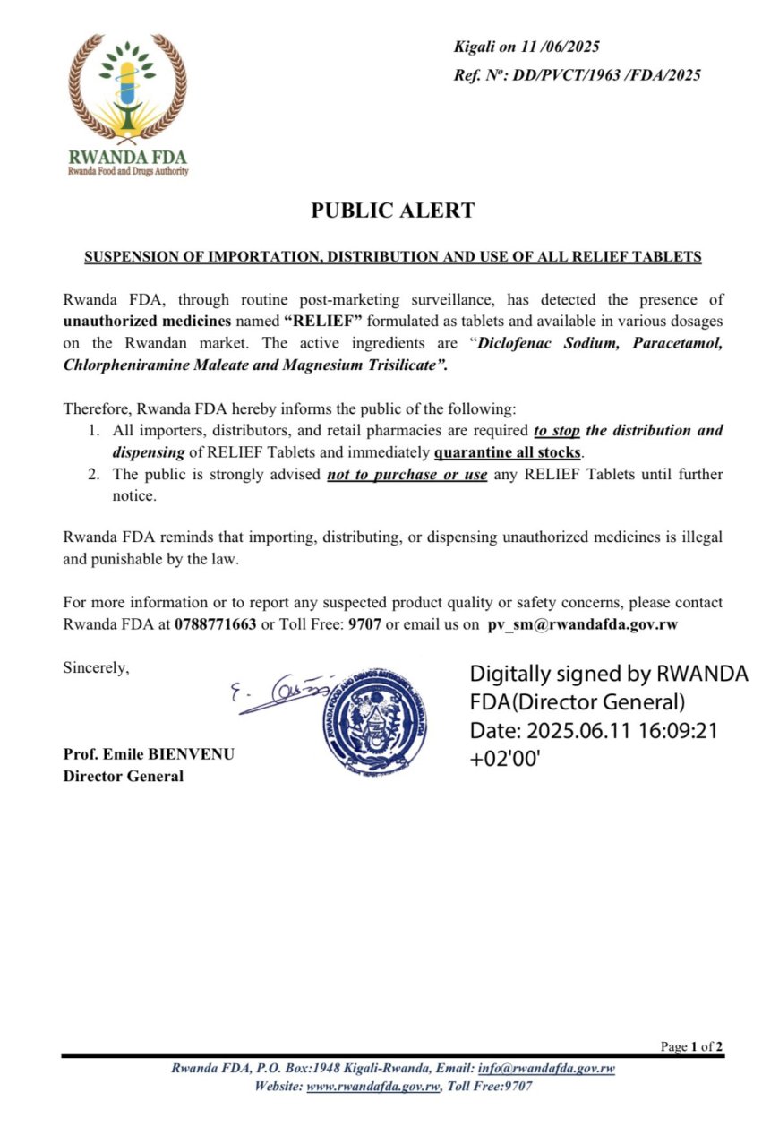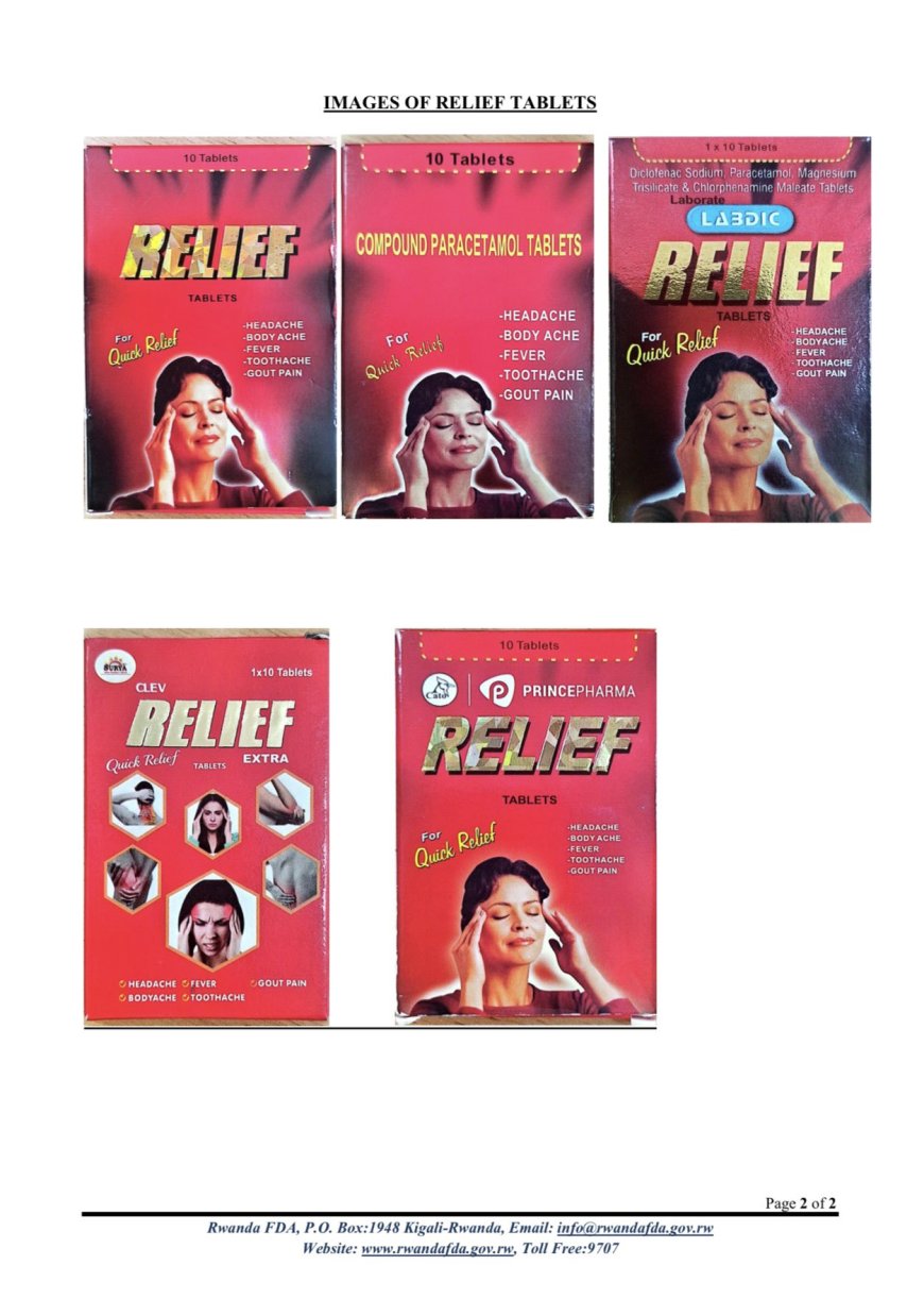 Rwanda FDA informs the public of the immediate suspension of the importation, distribution and use of all RELIEF Tablets until further notice.