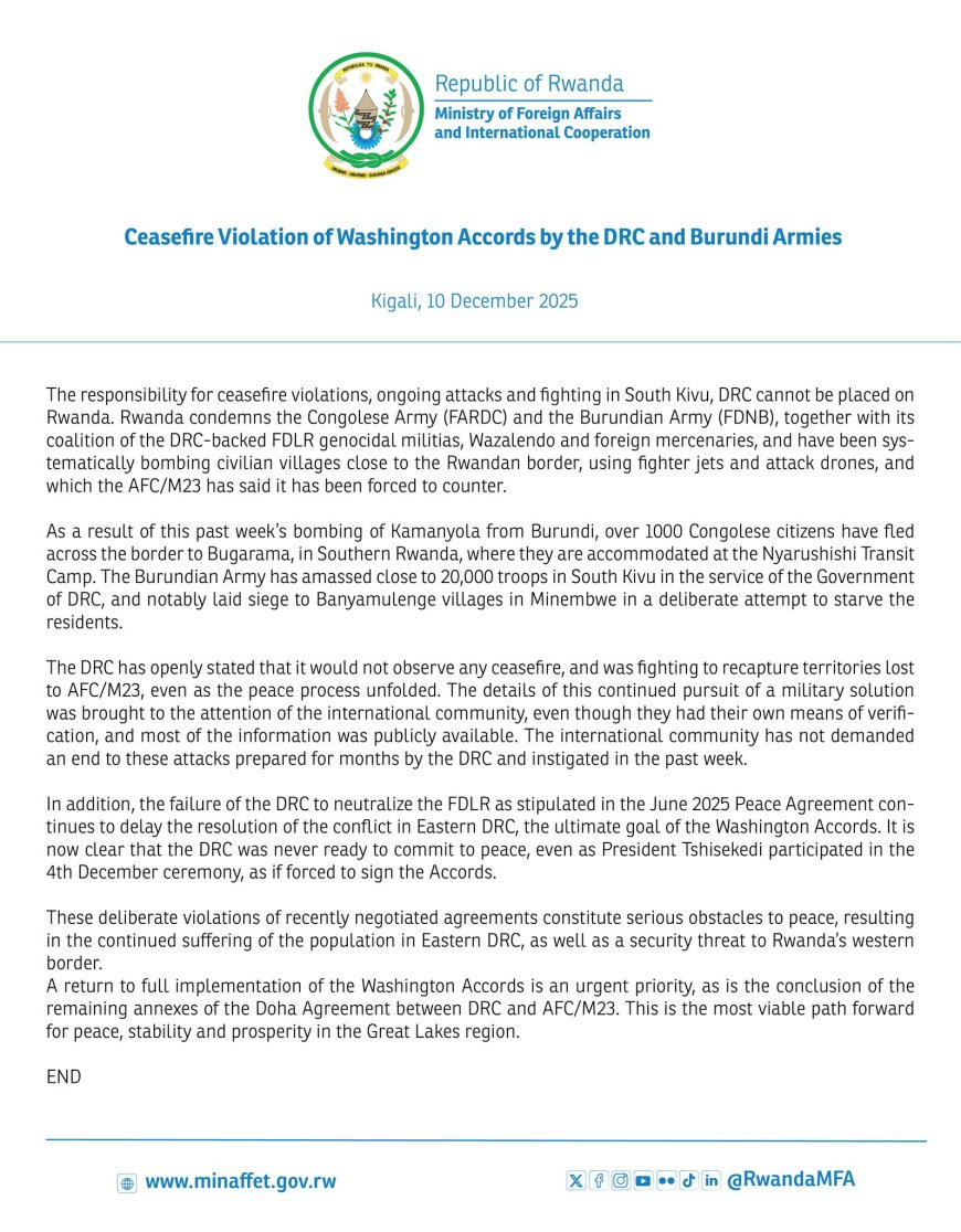 The Government of Rwanda has issued a firm statement accusing the Democratic Republic of Congo (DRC) and Burundi of repeatedly violating the Washington ceasefire accords, warning that their recent military actions threaten regional stability and worsen the humanitarian crisis in South Kivu.