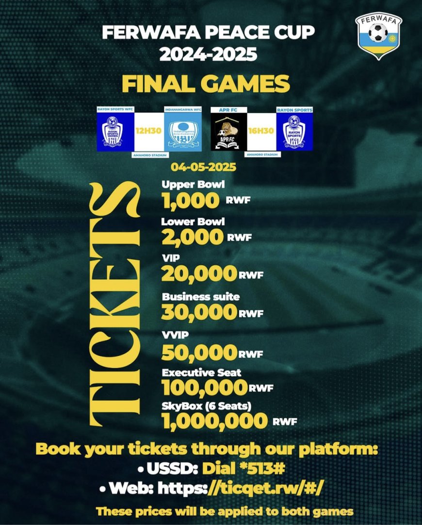 Ni ibiciro byagiye hanze kuri uyu wa gatanu tariki 2 Gicurasi 2025. Ibi biciro bishyizwe hanze mbere y'iminsi 2 kugirango umukino ube kuko biteganyijwe ko uzaba kuri iki cyumweru.