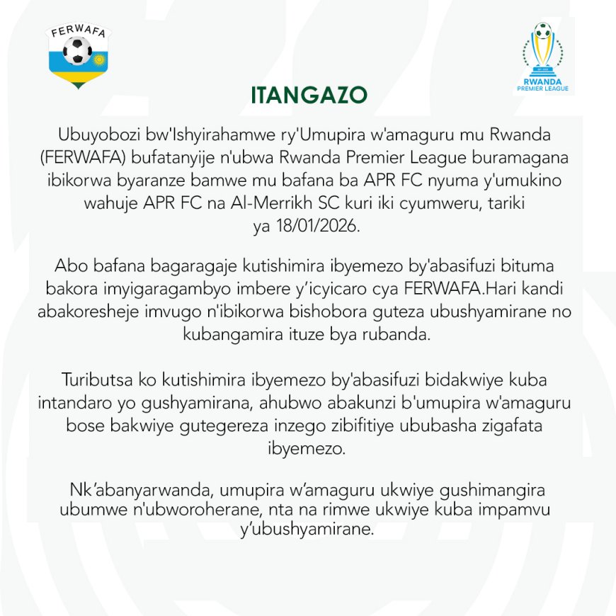 Mu gitondo cyo kuri uyu wa mbere tariki 19 Mutarama 2026, ubuyobozi bwa Rwanda Premier League ndetse na FERWAFA babyutse bamagana ibikorwa by'abakunzi ba APR FC bigaragambije bagateza umutekano mucye ku nzu ikoreramo FERWAFA, i Remera.