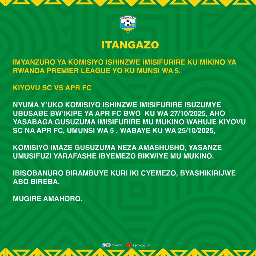 Ku wa Gatandatu tariki 25 Ukwakira 2025, nibwo APR FC yakinnye umukino w'umunsi wa Gatanu wa Shampiyona na Kiyovu Sports. Ni umukino warangiye ikipe zombi zinganyije 0-0 nubwo APR FC itishimiye imisifurire y'uyu mukino.