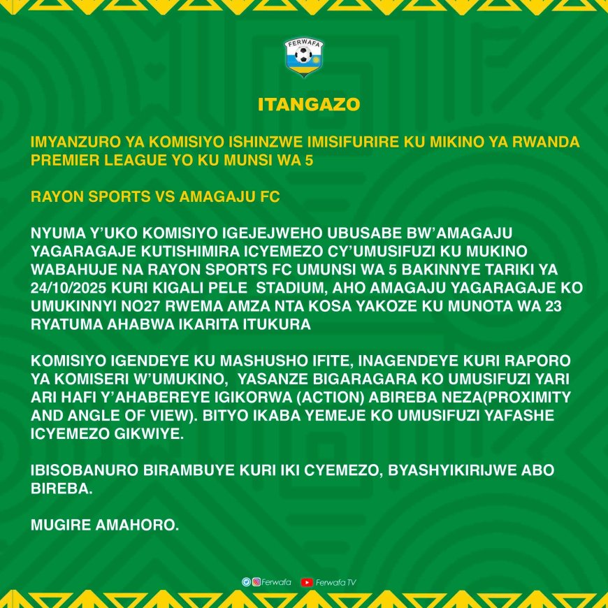 Ntabwo uyu mwanzuro ari wo FERWAFA yasohoye gusa, ahubwo yanatangaje ibyemezo byafashwe ku kirego Amagaju FC yaregeye ku mukino wabahuje Rayon Sports. Iyi kipe yo mu karere ka Nyamagabe, yasabye FERWAFA kubakuriraho ikarita y'umutuku yahawe Rwema Amza nyuma yikosa ryakorewe Aziz Bassane.