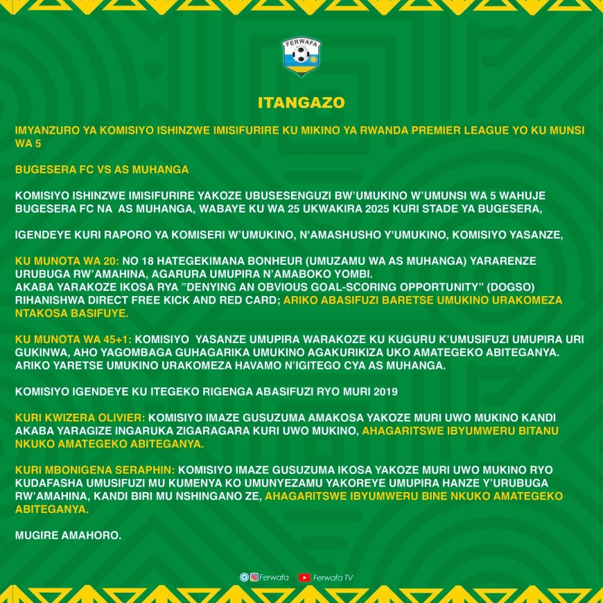 Ikindi kintu FERWAFA yasohoye ni ibihano byahawe Kwizera Olivier wasifuye umukino wahuje Bugesera FC na AS Muhanga. Uyu musifuzi yahawe kumara hanze y'ikibuga ibyumweru bitanu, ndetse na Mbonigena Seraphin wari ku ruhande yahawe kumara hanze y'ikibuga ibyumweru Bine.