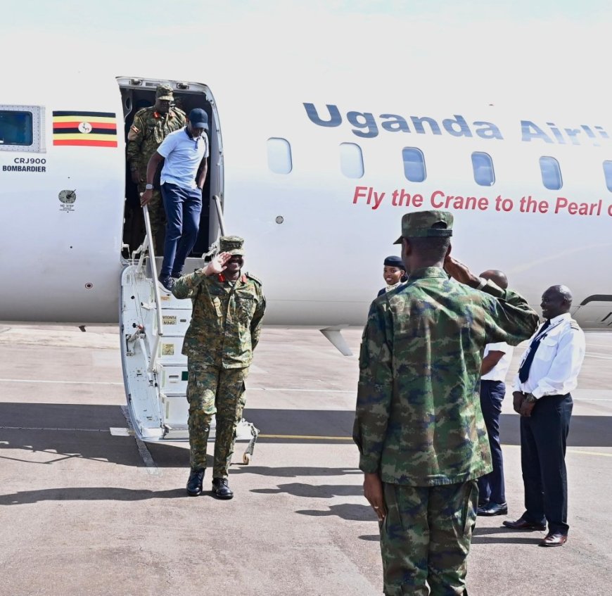 General Muhoozi yageze ku kibuga cy'indege cya Kanombe ku gicamunsi cyo kuri uyu wa 20 Werurwe 2025, yakirwa na mugenzi we General Mubarak Muganga, rukaba ari urugendo rwitezwemo ibiganiro bitandukanye birebana n'ubufatanye mu bya gisirikare hagati y'ibihugu byombi.