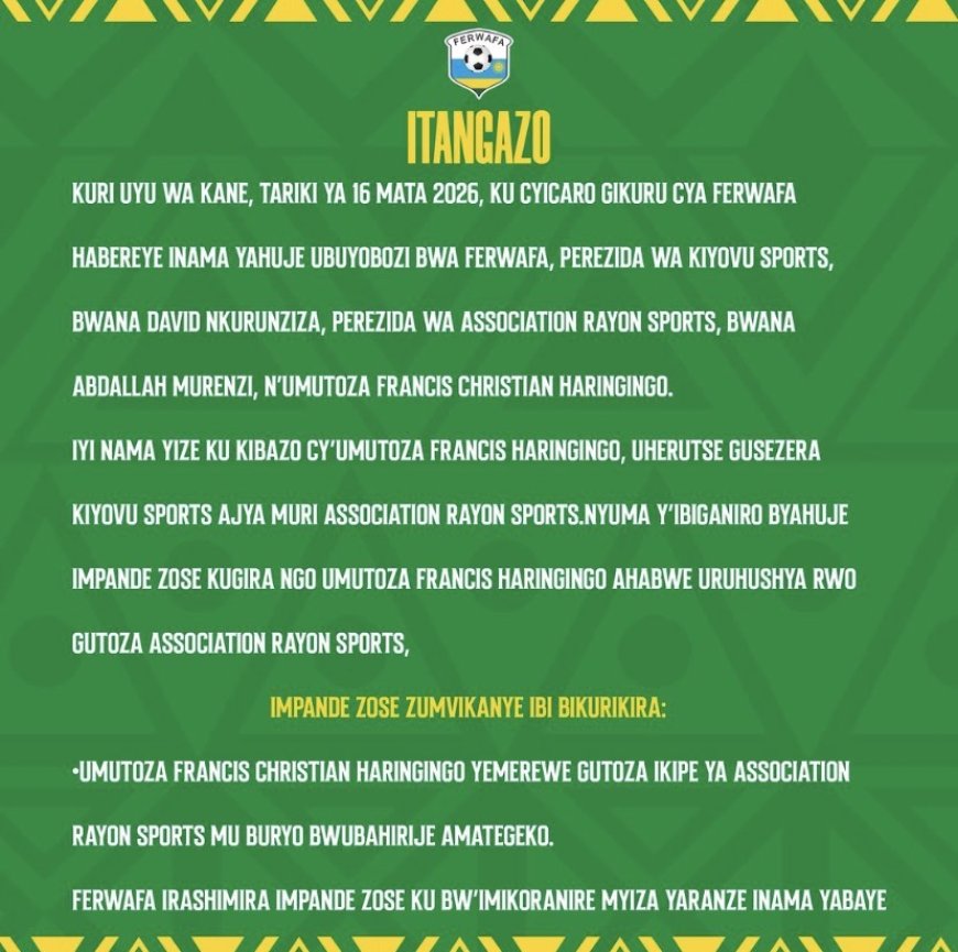 Ku itariki 27 Werurwe 2026, nibwo ikipe ya Kiyovu Sports yatanze ikirego muri FIFA imenyesha FERWAFA isaba ko yarenganurwa kuko Haringingo Francis yifuje gutandukana n’iyi kipe mu buryo bavuga ko bunyuranyije n’amtegeko agahita yerekeza muri Rayon Sports.