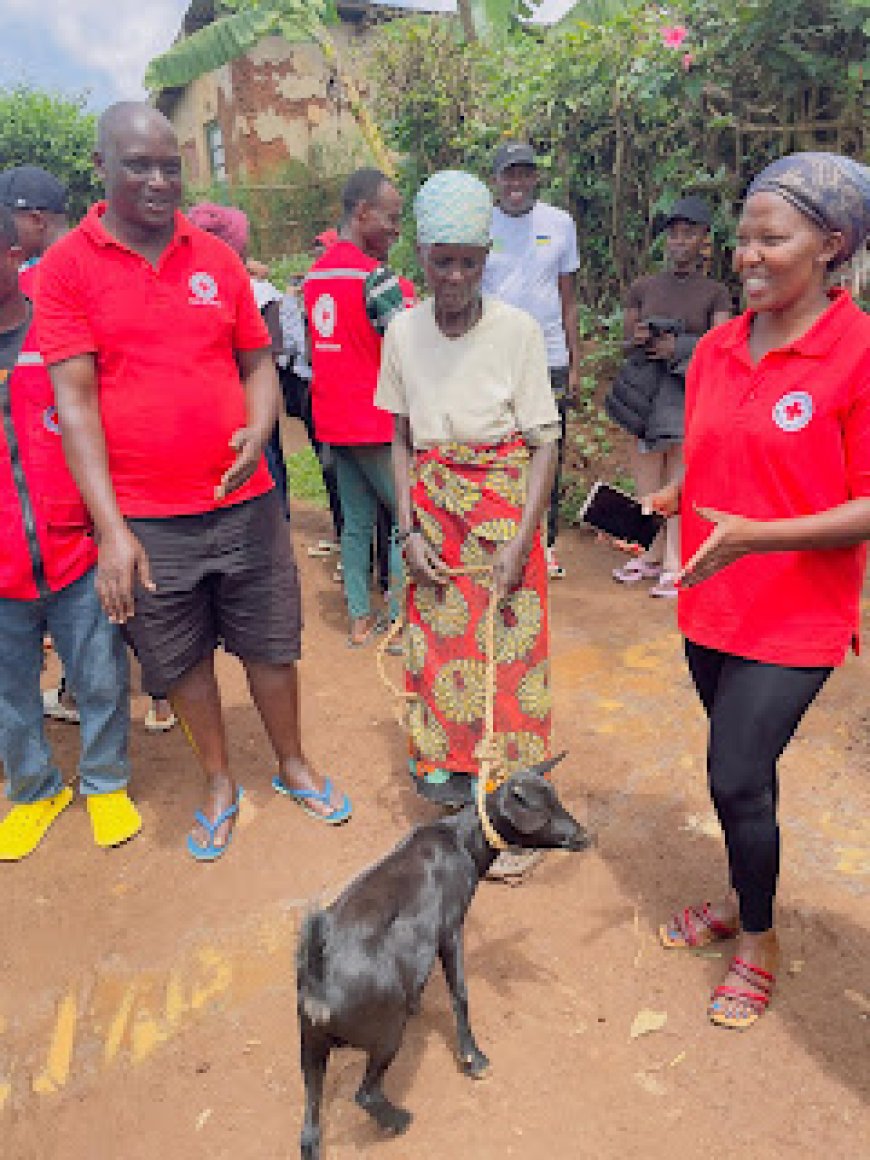 Umucecuru Mukankindi Thérèse w’imyaka 75 y’amavuko ari mu byishimo nyuma yo gusanirwa inzu akanorozwa itungo ry’ihene n’umuryango wa Croix Rouge ugizwe n’abanyeshuri biga muri Kaminuza y’u Rwanda ishami rya Huye.