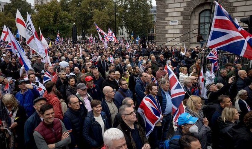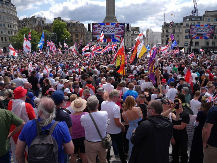 Mu maso y’abitabiriye, hagaragaraga ibyapa n’amabendera yanditseho amagambo agira ati “Stop the Boats”, “Send them Home” na “Unite the Kingdom”. Mu Kinyarwanda ugenekereje ni nko kuvuga ngo hagarika abinjira banyuze mu mato, bohereze iwabo, twunge ubumwe bw’ubwami.