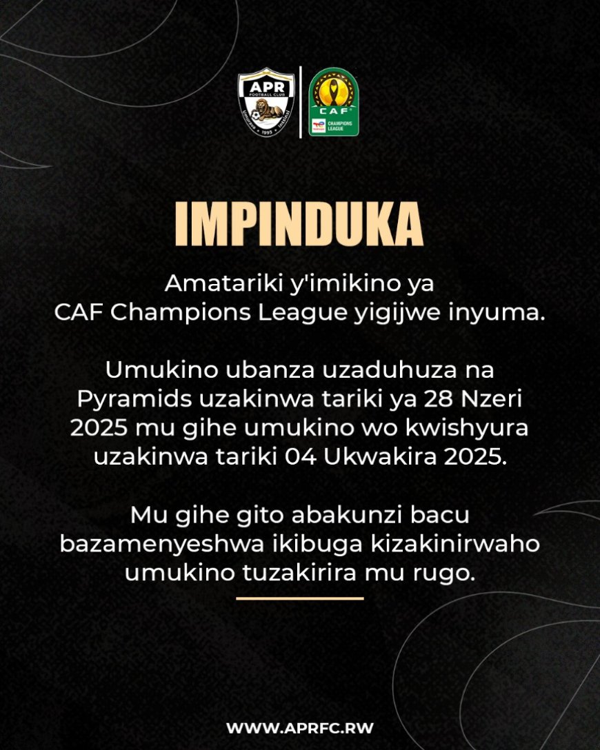 Ku munsi wejo hashize tariki 15 Kanama 2025, nibwo APR FC yamenyeshejwe ko umukino wayo na Pyramids FC amatariki wagombaga kuberaho yahindutse.