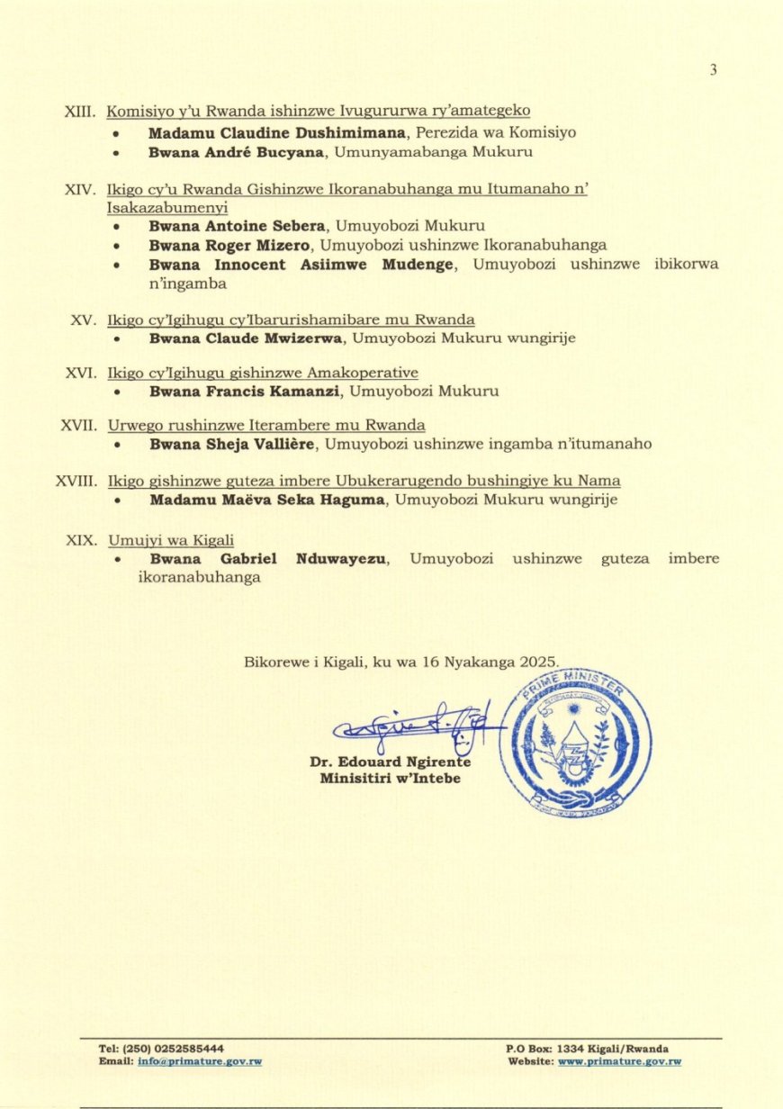 Mu Kigo Gishinzwe Amazi, Dr. Asaph Kabaasha, yagizwe Umuyobozi Mukuru. Mu kigo Mpuzamahanga cy’Imari cya Kigali, Hortense Mudenge, yagizwe Umuyobozi Mukuru.