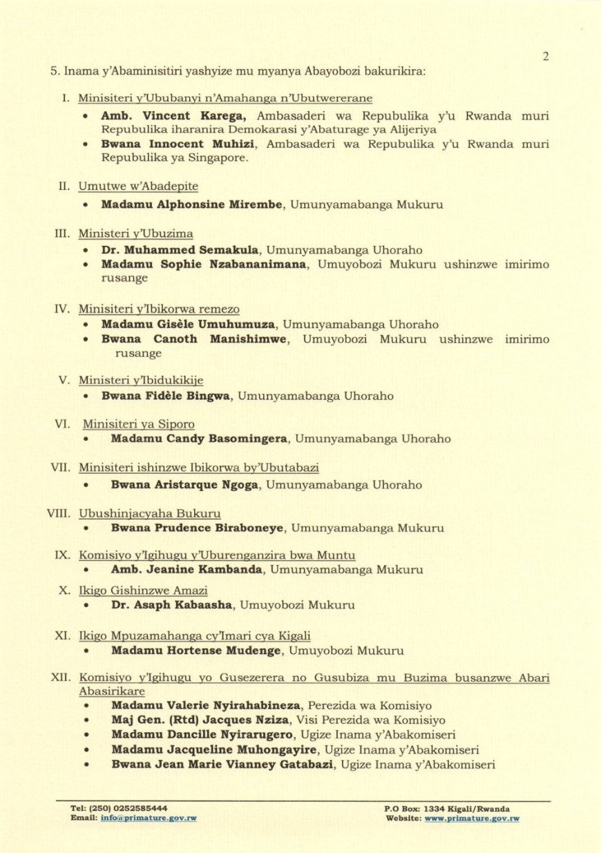 Muri Minisiteri y’Ibikorwa remezo, Gisèle Umuhumuza, yagizwe Umunyamabanga Uhoraho, Canoth Manishimwe, agirwa Umuyobozi Mukuru ushinzwe imirimo rusange mu gihe muri Ministeri y’Ibidukikije, Fidèle Bingwa, yagizwe Umunyamabanga Uhoraho. Muri Minisiteri ya Siporo, Candy Basomingera, yagizwe Umunyamabanga Uhoraho. Basomingera yari asanzwe ari Umuyobozi Mukuru Wungirije w’Ikigo cy’Igihugu gishinzwe guteza imbere ubukerarugendo bushingiye ku nama (RCB).