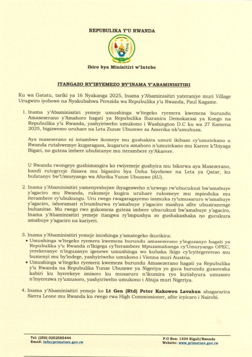 Inama yateranye kuri uyu wa 16 Nyakanga 2025 muri Village Urugwiro iyobowe na Perezida Kagame, yemeje umushinga w’itegeko ryemera kwemeza burundu Amasezerano y’Amahoro hagati ya Repubulika Iharanira Demokarasi ya Congo na Repubulika y’u Rwanda.