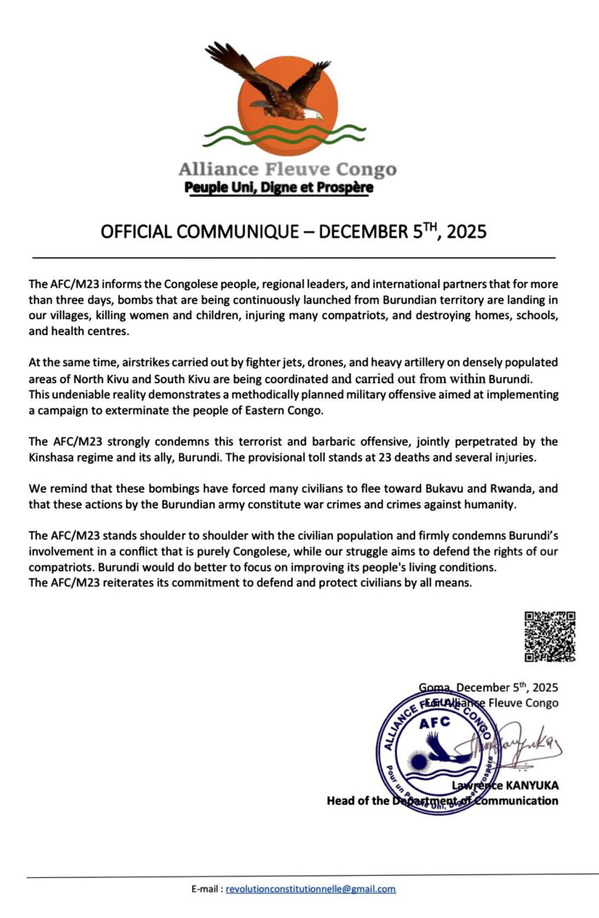 Umutwe wa AFC/M23 urashinja u Burundi n’ubutegetsi bwa Kinshasa ko bamaze iminsi batangije ibitero bikomeye birimo ibisasu n’ibitero by’indege ku baturage bo mu duce twa Kivu y'Amajyepfo, ibitero uvuga ko byahitanye abantu 23 kuri uyu wa gatanu, kandi bigateza akaga abaturage benshi bahunze ingo zabo.
