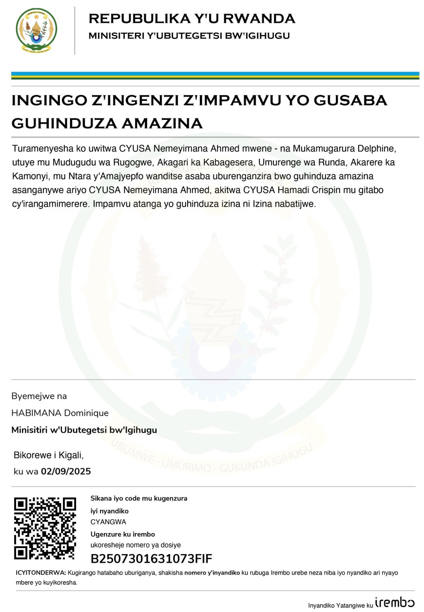 Uwitwa Cyusa NEMEYIMANA Ahmed arasaba guhindura amazina akitwa CYUSA Hamadi Crispin Mu gitabo cy'irangamimerere