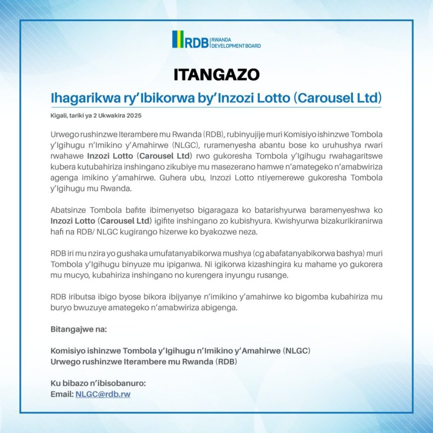 Urwego rw’Igihugu rw’Iterambere (RDB) rubinyujije muri Komisiyo ishinzwe Tombola y’lgihugu n’Imikino y’Amahirwe (NLGC), rwatangaje ko uruhushya rwari rwahawe Inzozi Lotto (Carousel Ltd) rwo gukoresha Tombola y’lgihugu rwahagaritswe kubera kutubahiriza inshingano zikubiye mu masezerano hamwe n’amategeko n’amabwiriza agenga imikino y’amahirwe.