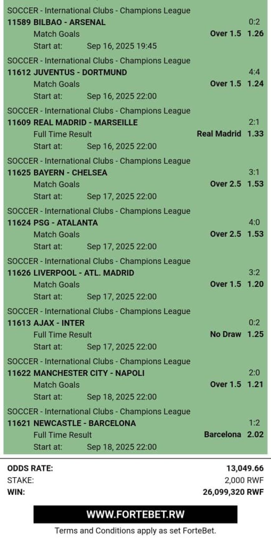 Byari ibihe bitoroshye ku mukunzi wa Fortebet aho yarategereje ko umukino urangira yari yaguze 1.5 mu mukino wa Manchester City Vs Napoli umukino urangira (2-0) naho Barcelona gutsindira New Castle iwayo muri Champions League yabaye mu cyumweru gishize!
