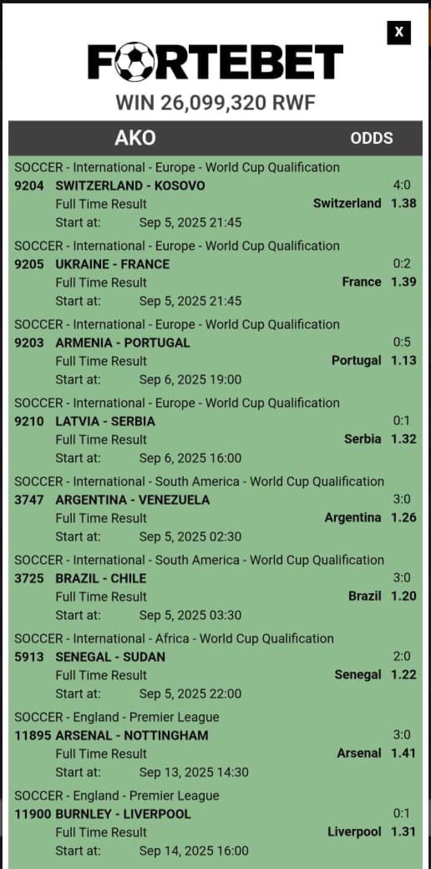 Uyu munyamahirwe washyizeho 2K yahisemo imikino cumi n’ibiri yatangiye ku itariki 5 z’Ukwa Cyenda naho iyo tike yarimaze iminai yarangiye ku itari ya 18 imikino yose yahise itsinze.
