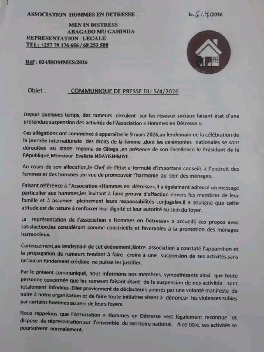 Iryo tangazo rikomeza rivuga ko kuva tariki ya 9 Werurwe 2026, hari abakoresha imbuga nkorambaga batangiye gukwirakwiza ibihuha bavuga ko ishyirahamwe " Abagabo mu Gahinda " ibikorwa rikora byahagaritswe nyuma y'ijambo rya Perezida Ndayishimiye Evariste.