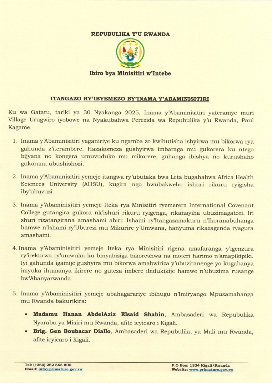 Inama y'Abaminisitiri yemeje itangwa ry'ubutaka bwa Leta buzahabwa 'Africa Health Sciences University (AHSU)', kugira ngo bwubakweho ishuri rikuru ryigisha iby'ubuvuzi, ndetse inemeza Iteka rya Minisitiri ryemerera 'International Covenant College' gutangira gukora nk'ishuri rikuru ryigenga, rinahabwa ubuzimagatozi.