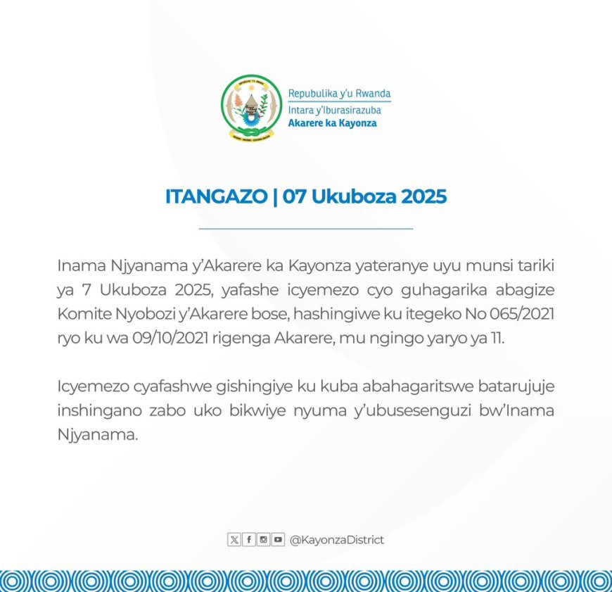 Inama Njyanama y'Akarere ka Kayonza yateranye kuri iki cyumweru yafashe icyemezo cyo guhagarika mu nshingano Umuyobozi w'ako karere n'abamwungirije.