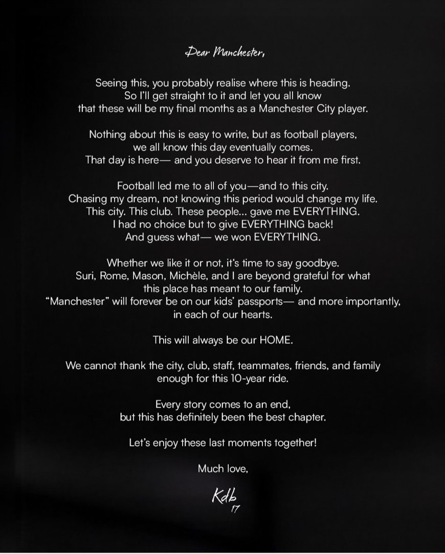 Ni ubutumwa Kevin De Bruyne yanyujije ku mbuga nkoranyambaga ze, kuri uyu wa gatanu tariki 4 Mata 2025, avuga ko bigoye kubitangaza ariko cyari cyo gihe cyo kubishyira ahagaragara gusa Manchester izahora ku mutima we ndetse n’uwu muryango we.