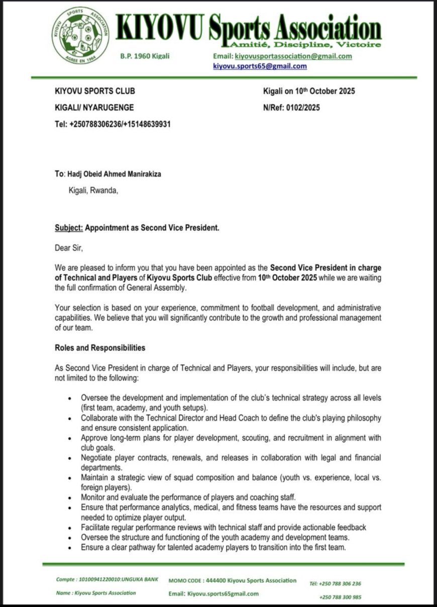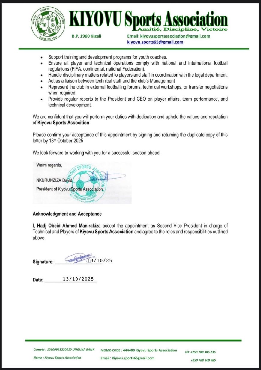 Ibi bikubiye mu itangazo ubuyobozi bwa Kiyovu Sports bwashyize ahagaragara kuri uyu wa mbere tariki 12 Ukwakira 2025. Ubuyobozi bwemeza ko bwashyizeho umuyobozi mushya wungirije mu bya Tekenike ndetse n'abakinnyi muri iyi kipe.