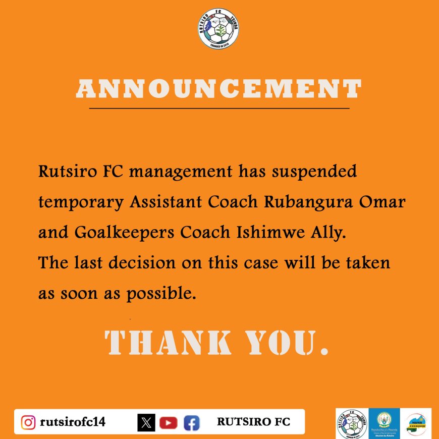 Kuri uyu wa Mbere tariki 5 Mutarama 2026, nibwo ubuyobozi bwa Rutsiro FC bwatangaje ko umutoza wungirije Rubangura Omar ndetse n’umutoza w’abazamu Ishimwe Ally, bahagaritswe by’agateganyo.