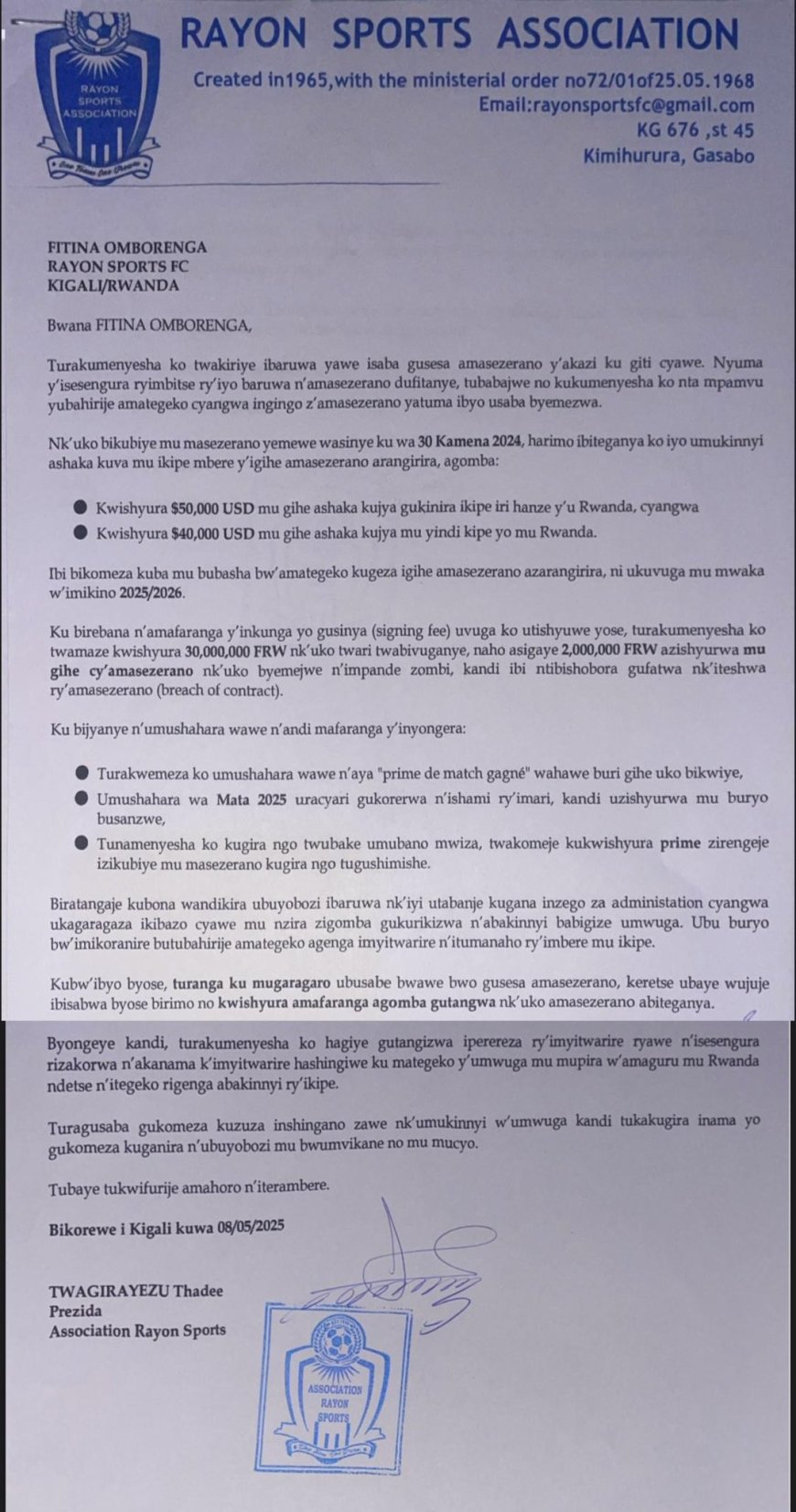 Uretse ibi byose, Rayon Sports yatangaje ko yatangiye iperereza ku myitwarire ya Fitina Omborenga, aho bashaka kureba niba hari ibyo yakoze binyuranyije n’amahame agenga abakinnyi n’amasezerano asinywa hagati y’uruhande rw’umukinnyi n’ikipe.
