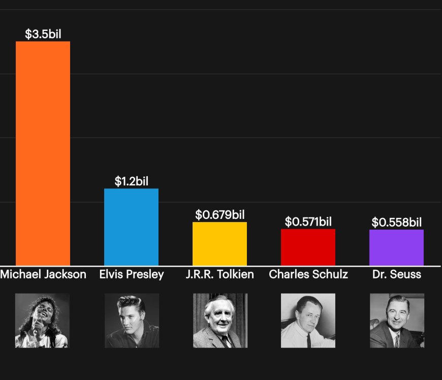 Mu 2025 Michael Jackson yinjije miliyoni $105. Ku mwanya wa gatatu n’uwa kane hari abahoze mu itsinda ryitwa Pink Floyd ryashinzwe mu 1965 rikora umuziki wo mu njyana ya Rock’ Richard Wright na Syd Barrett binjije miliyoni $81 muri uyu mwaka wa 2025.