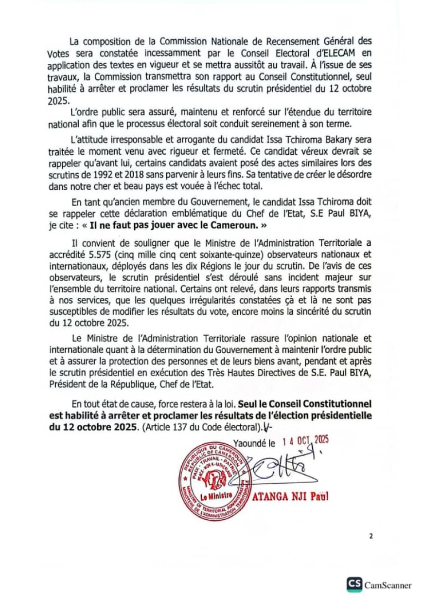 Minisitiri w’Imiyoborere mu Gihugu cya Cameroon, Paul Atanga Nji, yamaganiye kure amakuru yatangajwe n’umukandida utavuga rumwe n’ubutegetsi bw’icyo gihugu, Issa Tchiroma Bakary, avuga ko ari we watsinze amatora ya Perezida w’icyo gihugu.