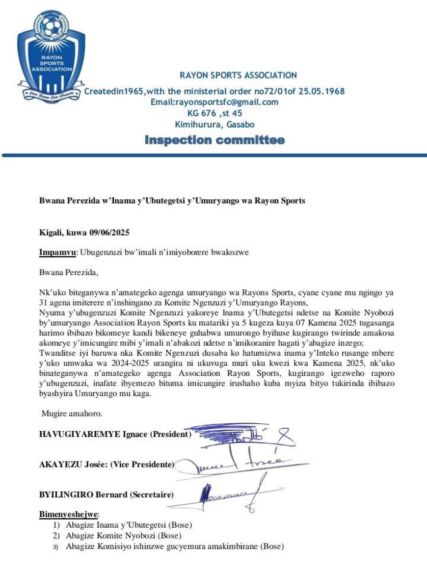 Ku wa mbere tariki 9 Kamena 2025, nibwo komite ngenzuzi ya Rayon Sports, yandikiye ibaruwa ubuyobozi bw'umuryango wa Rayon Sports, isaba inama y'Inteko rusange.