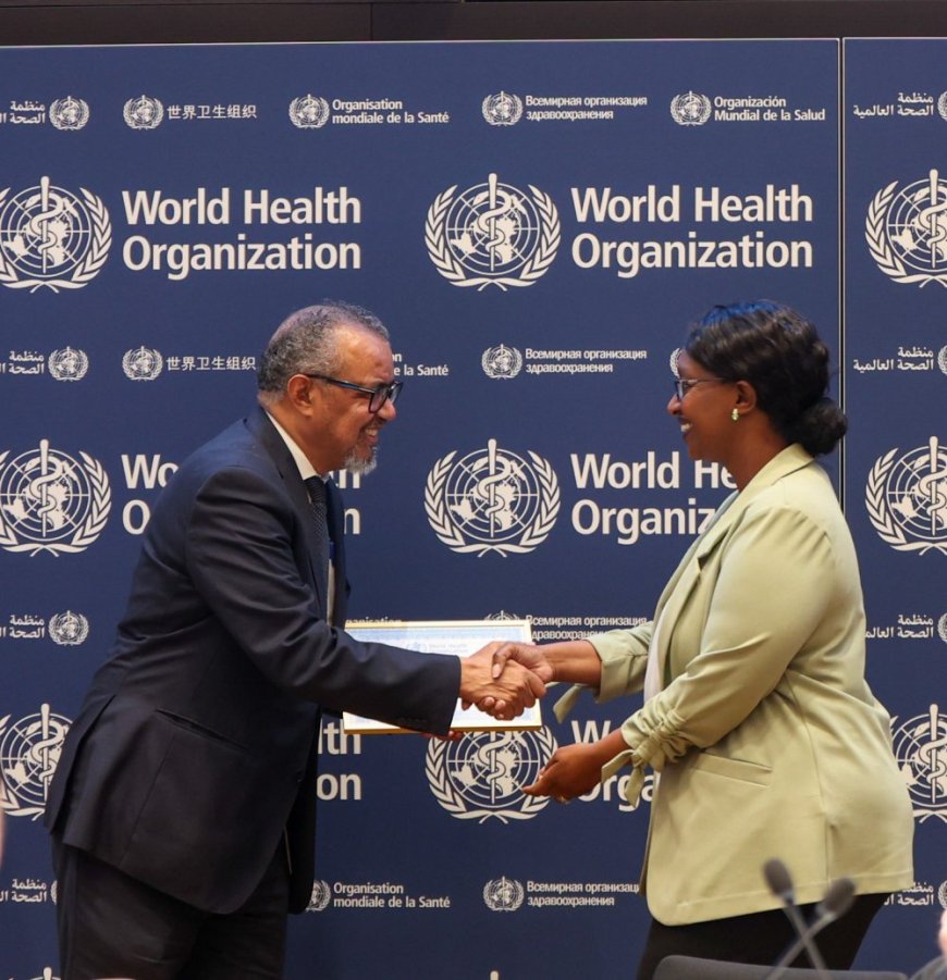 Igihembo cyatanzwe n’Umuyobozi wa WHO, Dr Tedros Ghebreyesus Adhanom, cyakiriwe n’Ambasaderi uhoraho w’u Rwanda ku Cyicaro cy’Umuryango w’Abibumbye i Geneva mu Busuwisi Urujeni Bakuramutsa, mu izina rya Perezida Kagame.