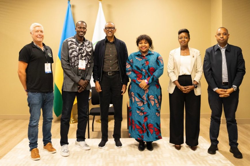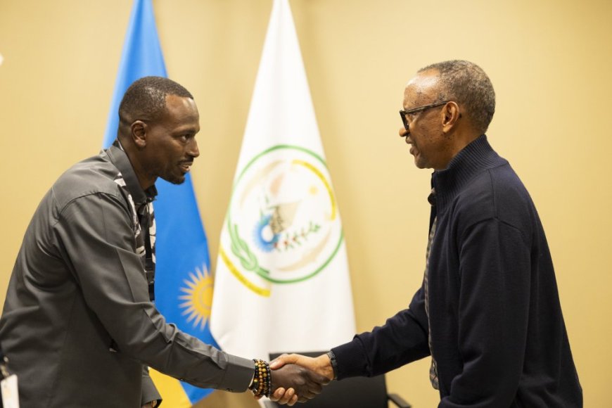Perezida Kagame na Cheick Camara bahuriye muri BK Arena, aho bari bitabiriye umukino wahuje APR BBC na MBB South Africa, mu mikino ya Basketball Africa League (BAL), mu gice cya Nile Conference kiri gukinirwa i Kigali.