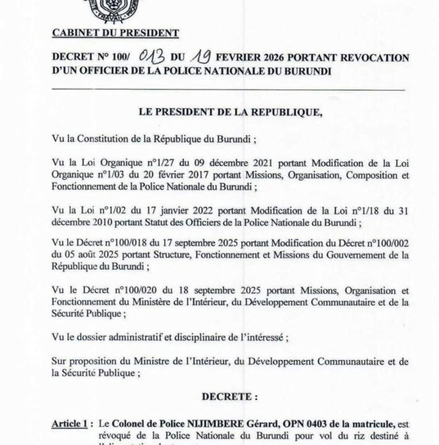 Perezida wa Repubulika y’u Burundi akaba n’Umuyobozi w’Umuryango wa Afurika Yunze Ubumwe (AU) muri iki gihe, Évariste Ndayishimiye, yafashe icyemezo cyo kwirukana mu gipolisi umu Coloneli umwe ukurikiranyweho kwiba imifuka y’umuceri wagenewe gutunga abapolisi.