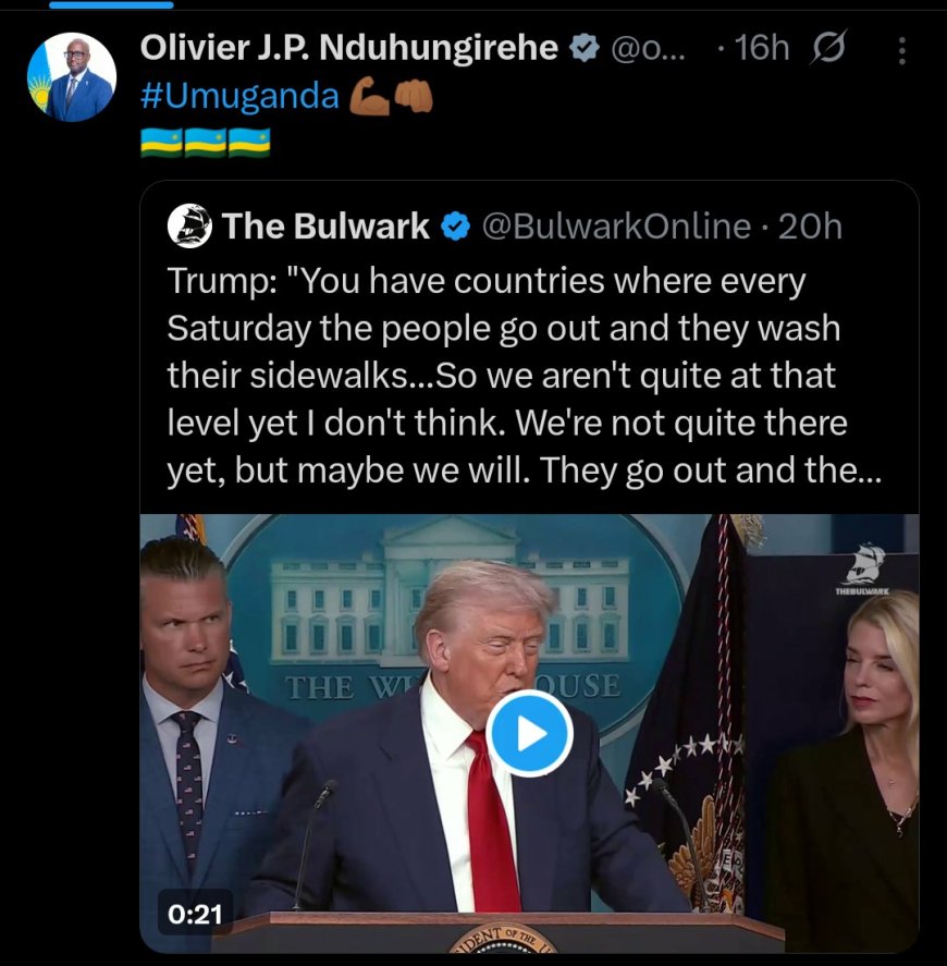 Minisitiri w’Ububanyi n’Amahanga n’Ubutwererane w’u Rwanda, Ambasaderi Olivier Nduhungirehe, yavuze ko ibyo Trump yavugaga mu Rwanda byitwa, "Umuganda".