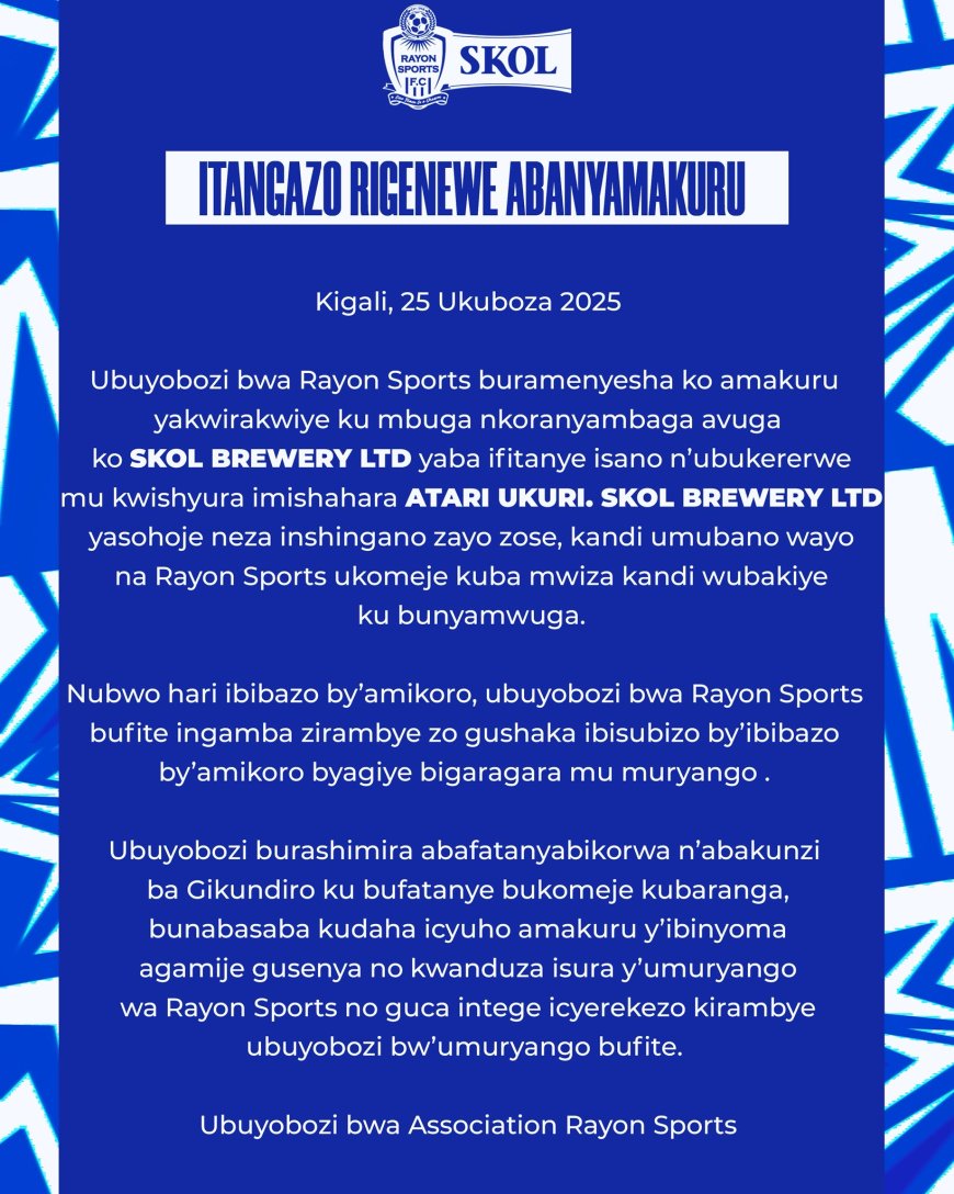 Yagize iti “ Ubuyobozi bwa Rayon Sports buramenyesha ko amakuru yakwirakwiye ku mbuga nkoranyambaga avuga ko Skol Brewery Ltd yaba ifitanye isano n'ubukererwe mu kwishyura imishahara atari ukuri. Skol Brewery Ltd yasohoje neza inshingano zayo zose, kandi umubano wayo na Rayon Sports ukomeje kuba mwiza kandi wubakiye ku bunyamwuga."