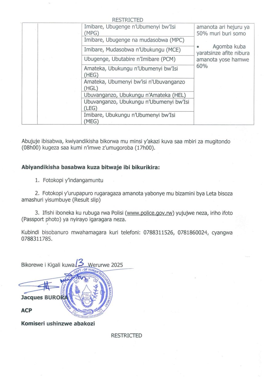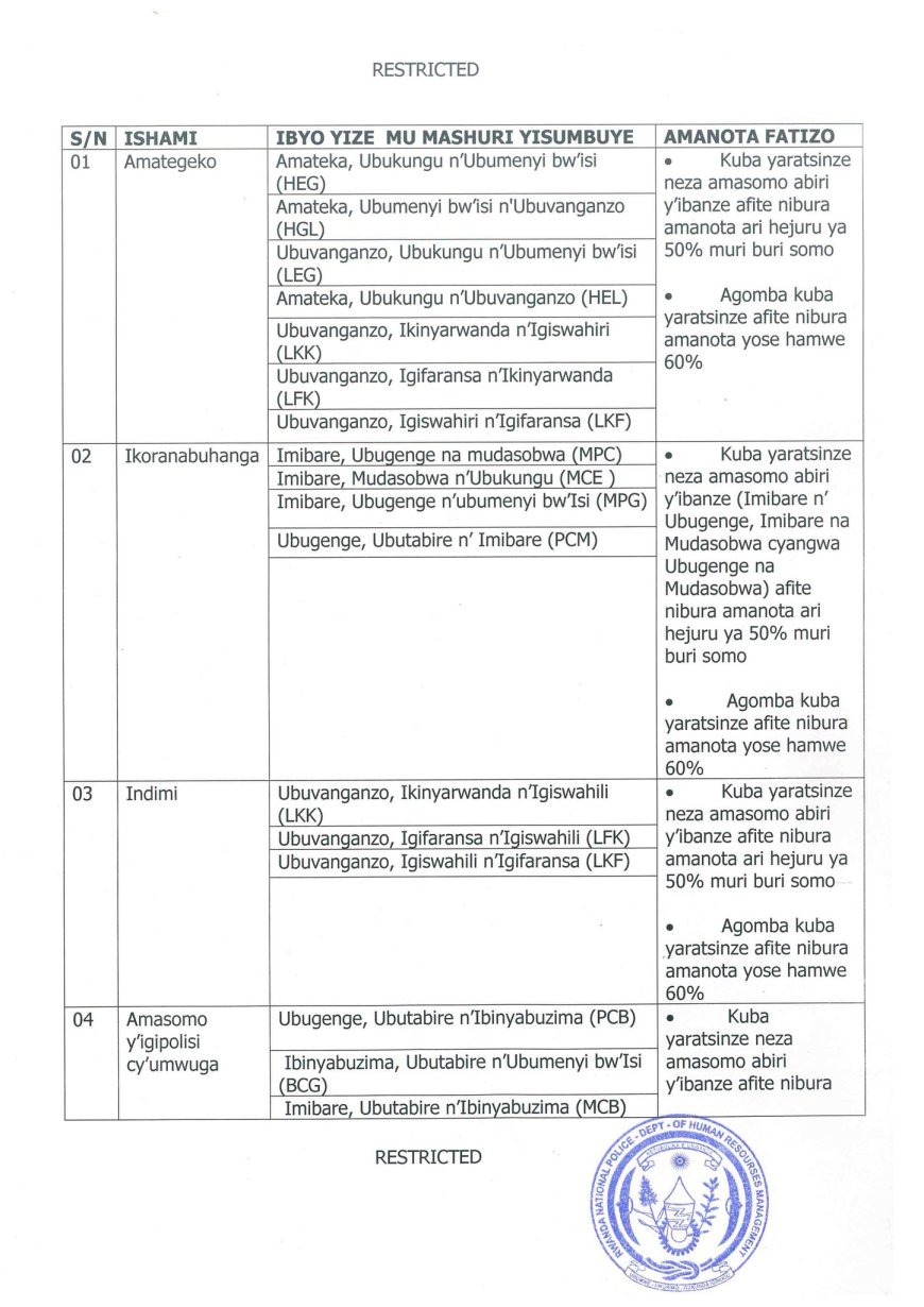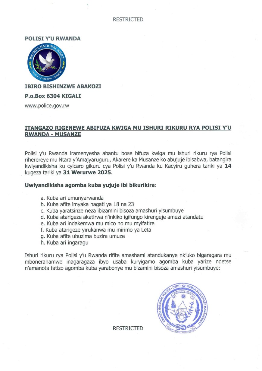 Polisi y’ u Rwanda iramenyesha abantu bose bifuza kwiga mu ishuri rikuru rya Polisi riherereye mu Ntara y’Amajyaruguru, Akarere ka Musanze, ko abujuje ibisabwa batangira kwiyandikisha ku Cyicaro gikuru cya Polisi y’u Rwanda gihereye ku Kacyiru mu Karere ka Gasabo guhera tariki ya 14 kugeza tariki ya 30 Werurwe 2025.