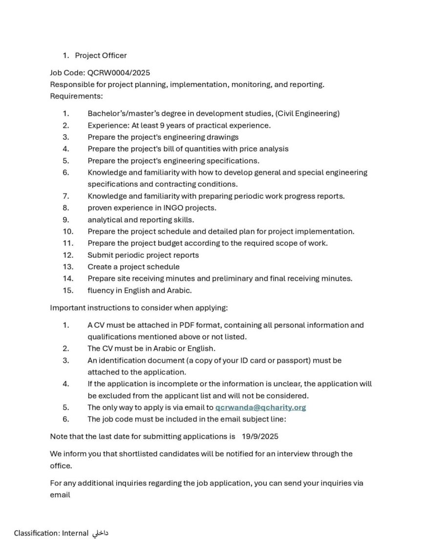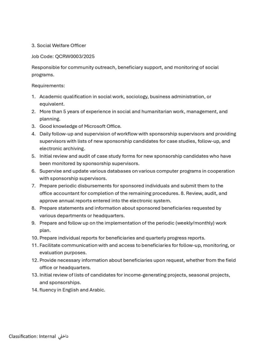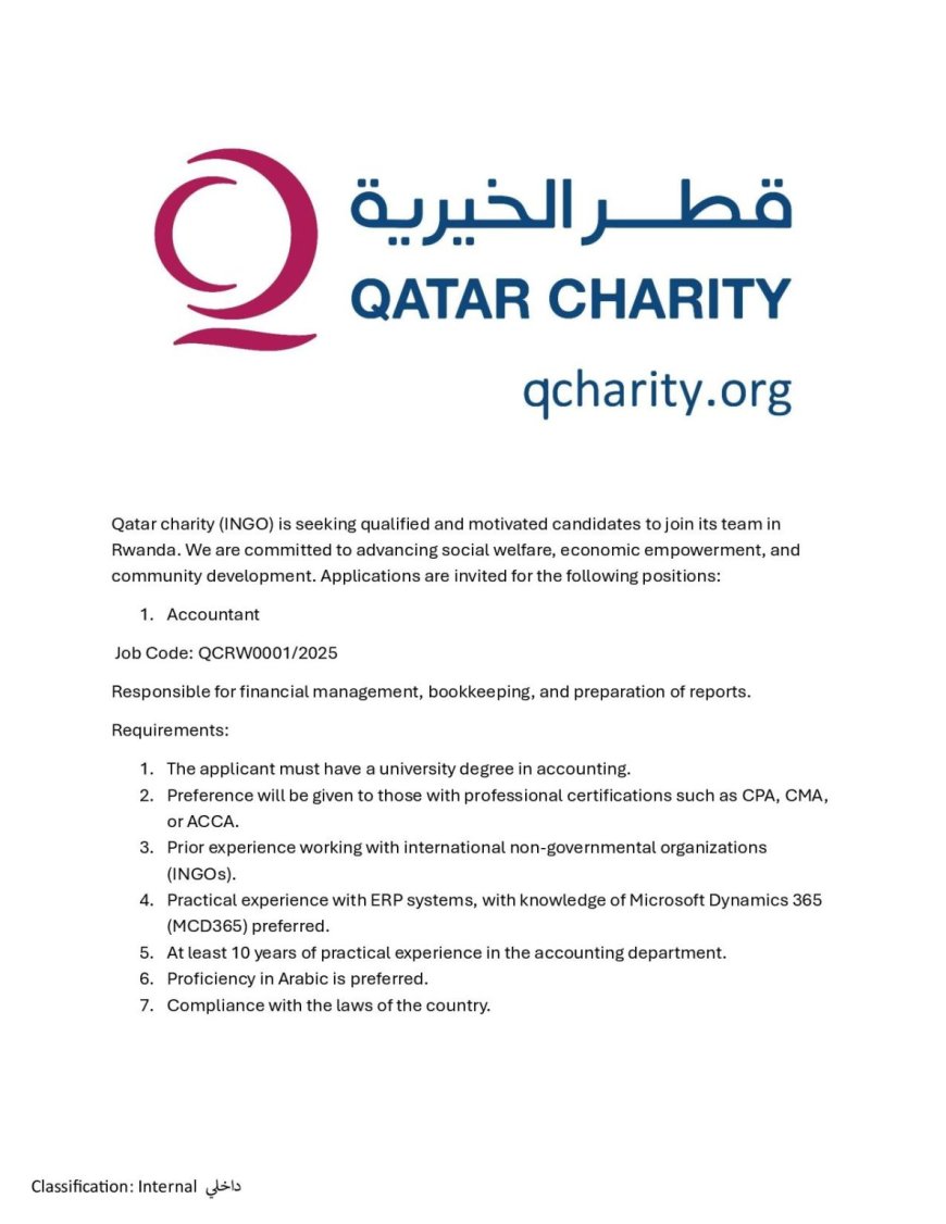 Qatar Charity (INGO): Job Advertisement for an Accountant, Administrative Assistant, Social Welfare Officer, and Project Officer